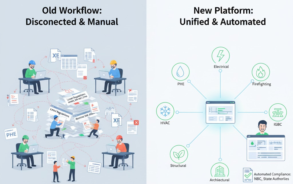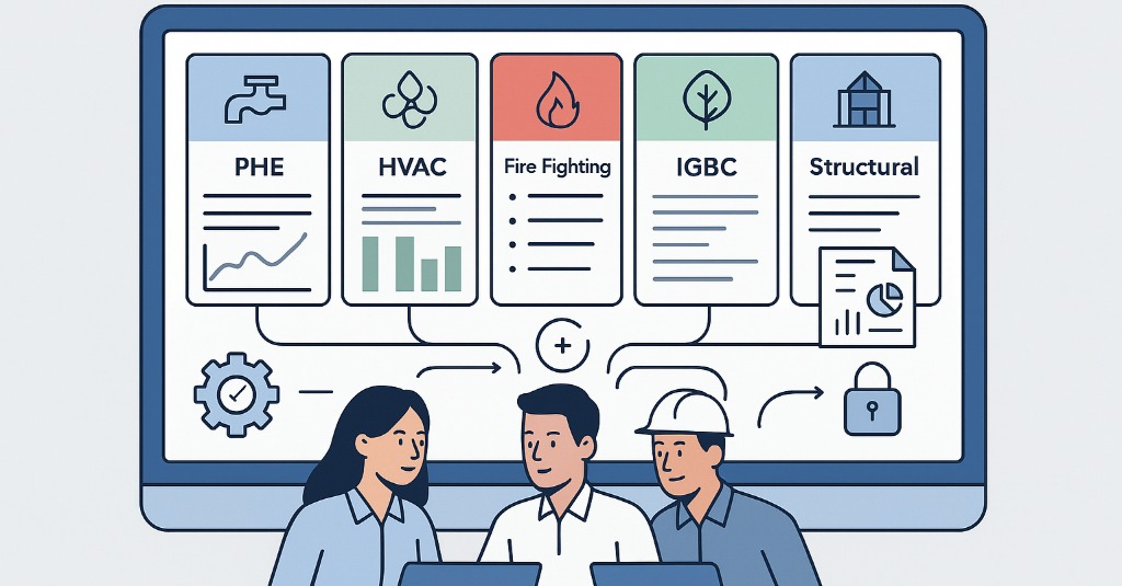 Design Calculus unifies PHE, HVAC, Electrical, Fire Fighting, Architectural, and Structural modules into a single platform where all calculations are automated and collaboration is seamless.